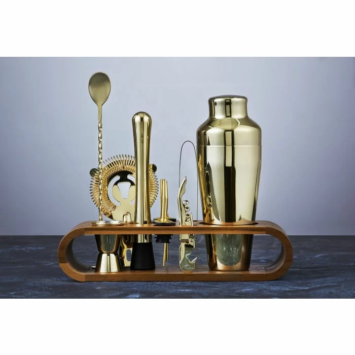 DAVIS & WADDELL 10 PIECEÂ BAR SET IN GOLD WITH ACACIA STAND