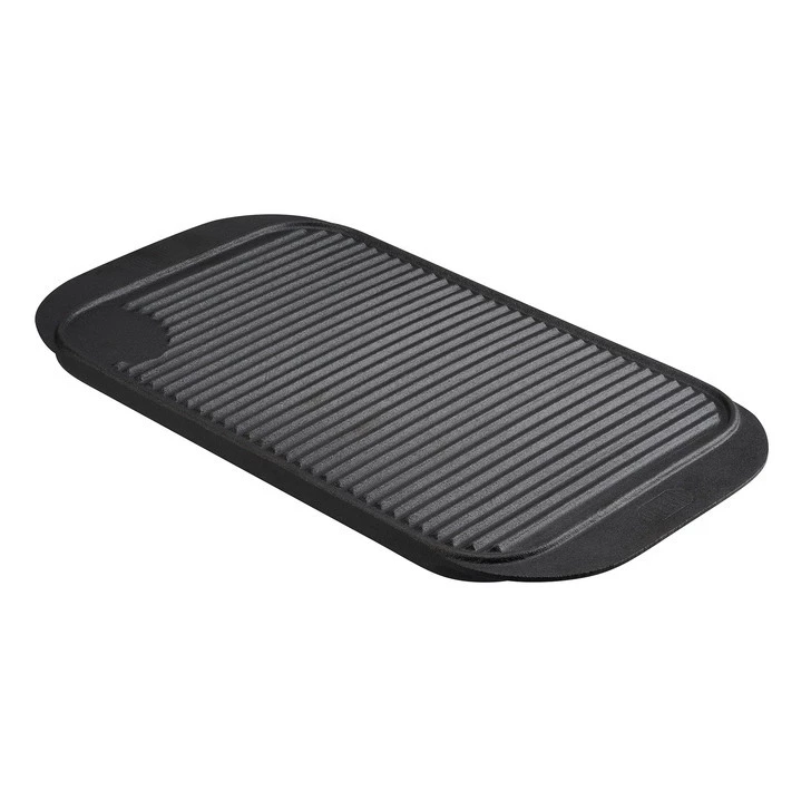 This PYROCAST 48 x 26cm Rectangular Grill Tray is a generous size to cook for a crowd, indoors or outdoors. The grill surface is perfect for cooking meats and fish, turn over to the smooth side for eggs and pancakes. Features built in handles for easy carrying or rotating. Rectangular design allows for skewers of prawns, chicken, steak or vegetables. Grooved surface creates professional sear marks on your food.