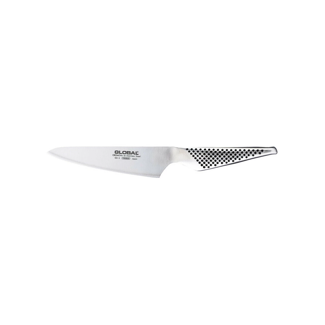 The GS-3 is made from CROMOVA 18 stainless steel, specially developed by GLOBAL as it holds a razor-sharp edge and resists rust, stains and corrosion. Ice tempered and hardened to Rockwell C56-58, each knife is carefully weighted by filling the handles with sand to achieve the optimum weight and perfect balance. The acute 15-degree angle cutting edge provides unsurpassed performance and superior edge retention.