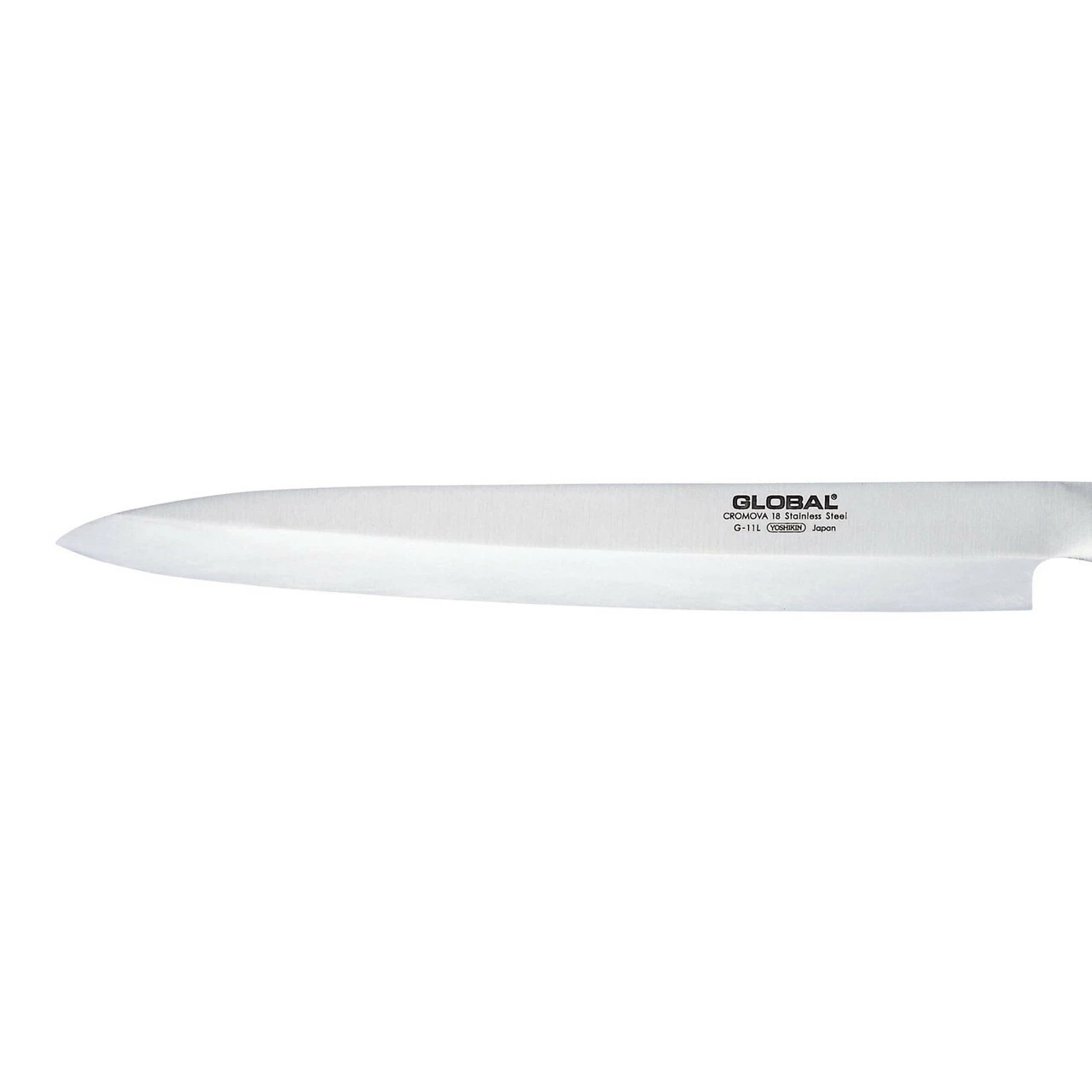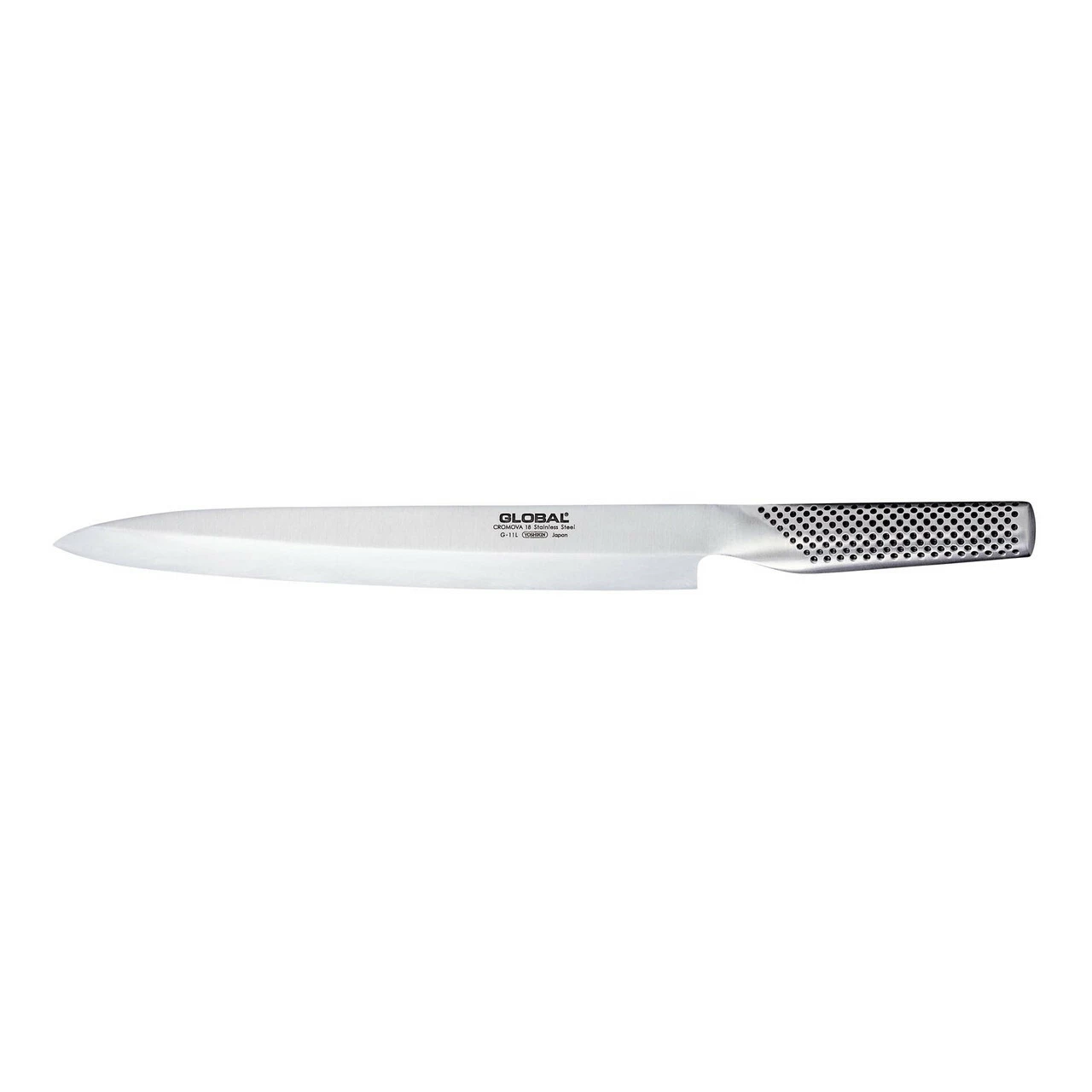 The G-11 is made from CROMOVA 18 stainless steel, specially developed by GLOBAL as it holds a razor-sharp edge and resists rust, stains and corrosion. Ice tempered and hardened to Rockwell C56-58, each knife is carefully weighted by filling the handles with sand to achieve the optimum weight and perfect balance.Β