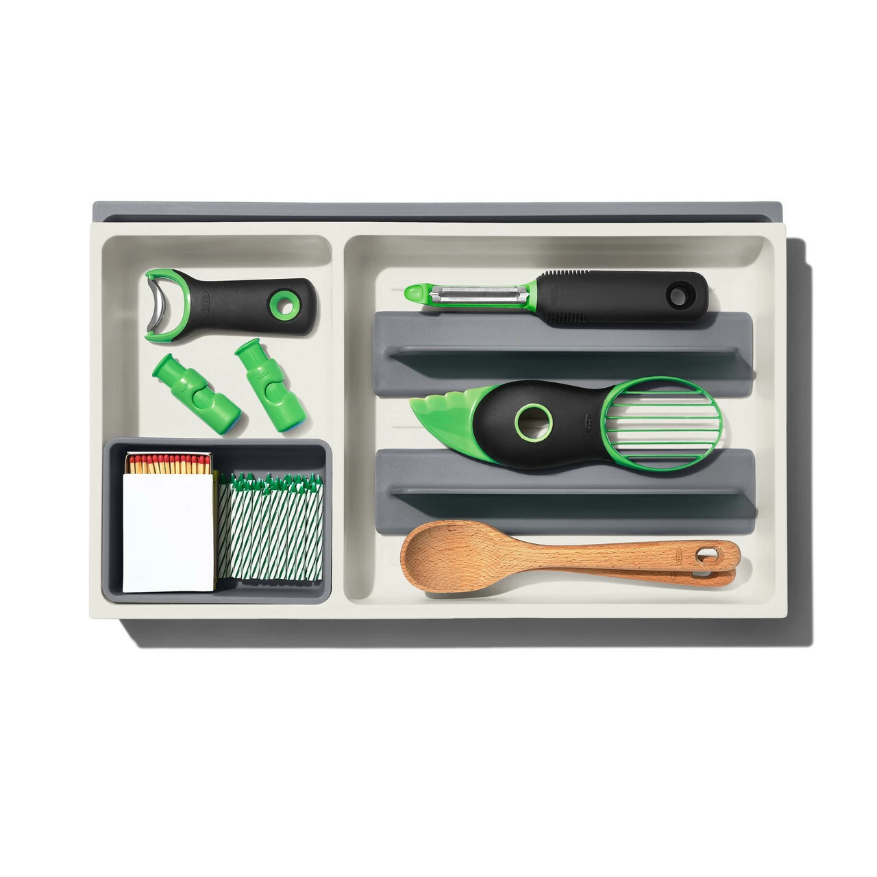 The OXO Good Grips Large Expandable Kitchen Tool Drawer Organiser helps you store tools with control. The extendable open area is perfect for irregular-shaped or long-handled utensils, and the adjustable dividers allow you to customise the Organiser for your kitchenβs needs. Our organiser includes a storage cup that provides a neat and tidy landing spot for small gadgets like wine stoppers and bag clips. The non-slip feet keep the Organiser in place when you open and close the drawer. The space-maximizing design features square corners to eliminate gaps and deliver a clean look in your drawers. The dividers and storage cup are removable for thorough cleaning.