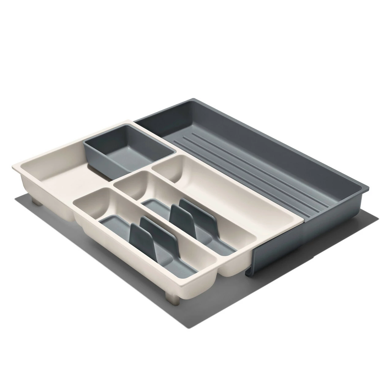 The OXO Good Grips Expandable Utensil Drawer Organiser helps you declutter any size drawer. The utensil caddies save space by keeping utensils neatly stacked, and the large, undivided area is ideal for irregular-shaped kitchen tools, like can openers. The Organiser even includes a removable cup for small, hard-to-store gadgets, like wine stoppers and corn holders. The non-slip feet keep the Organiser in place when you open and close the drawer. The space-maximizing design features square corners to eliminate gaps and deliver a clean, custom look in your drawers. The trays are removable for thorough cleaning and for ease when setting the table.