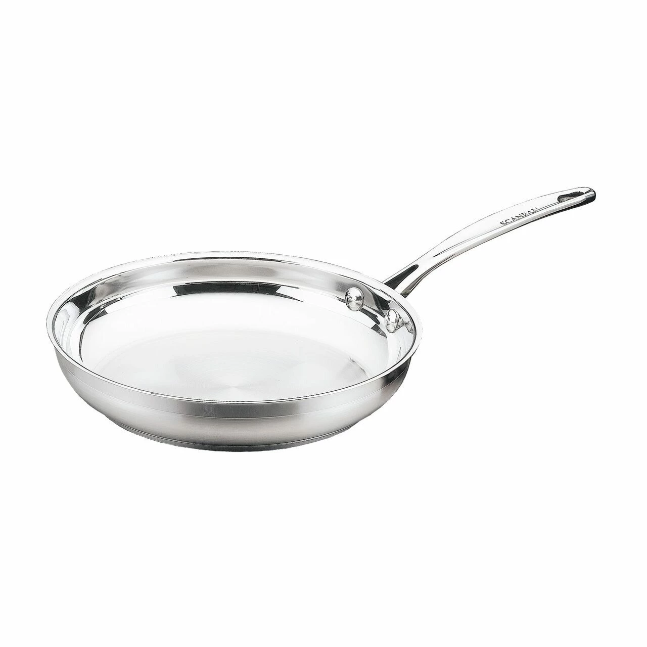 This 28cm Fry Pan has a stylish two tone matt/polished appearance. The optimal 6.4mm thick bonded sandwich base ensures optimal heat distribution. Compatible with all energy sources including induction, this range is as wide as it is popular. The rim design allows for drip-free pouring and the handles are secured with stainless steel rivets.ย