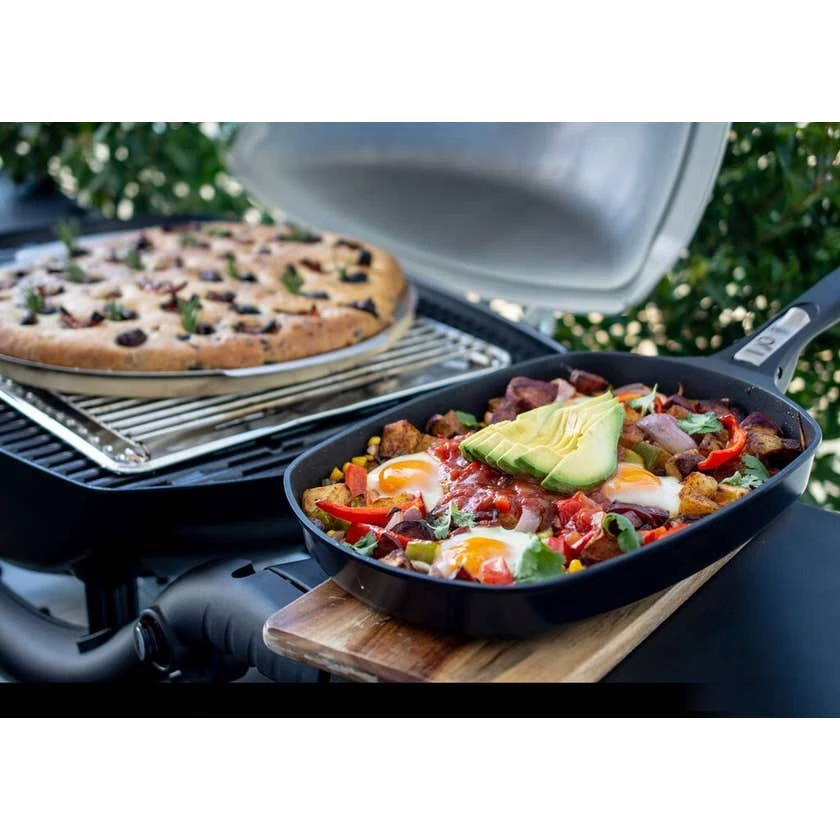 1 Large Q Ware Frying pan with large detachable handle. Great for cooking omelettes, schnitzels,Β potato bakes, deserts and more. The high performance Weber Titanium non-stick coating makes cooking a pleasure and cleaning a breeze.